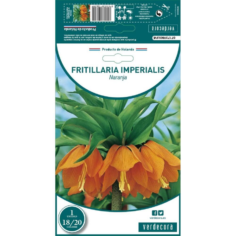 La Fritillaria Naranja es una planta bulbosa perenne originaria de Asia y conocida por sus llamativas flores en forma de campana colgante de color naranja brillante. Esta planta ornamental es apreciada por su porte majestuoso y es ideal para jardines, donde aporta un toque exótico y elegante.