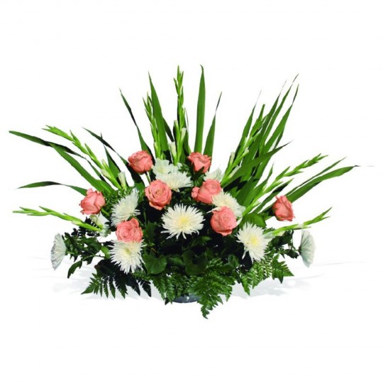 Composición floral en abanico con flores naturales para Todos Los Santos, compuesta por: