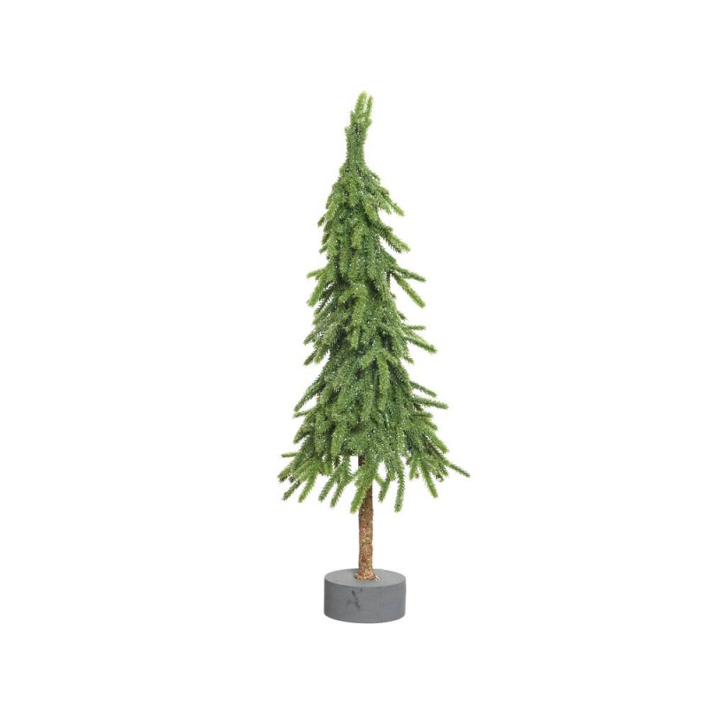 Mini árbol de navidad artificial con base redonda y detalle de tronco en madera natural. Este mini abeto, con su toque de purpurina, es perfecto apra dar un toque navideño y natural a cualquier rincón de tu hogar. Ideal para espacios pequeños.
