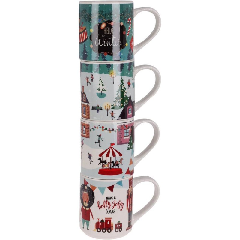 Set de tazas con diseños navideños coloridos, presentadas en estuche cilíndrico decorado, perfectas para regalar o disfrutar en la temporada festiva.