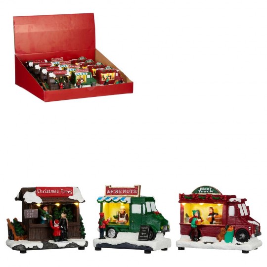 Mercado de Navidad surtido con 3 modelos diferentes de 12 x 7,5 x 10 cm, perfecto para recrear la magia de los tradicionales mercadillos invernales. Cada pieza está cuidadosamente detallada, con puestos y vehículos decorados que aportan color y realismo a la escena. Ideal para complementar pueblos navideños, decorar mesas o estanterías y crear un ambiente festivo lleno de encanto.
