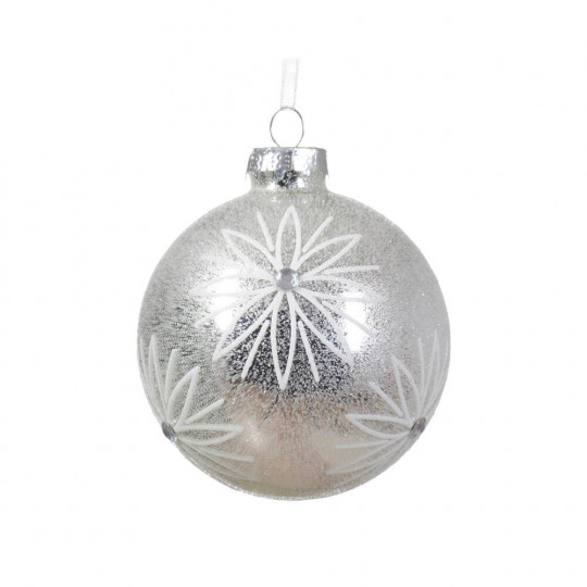 Bola de cristal transparente con diseño de flores en color blanco y detalle de purpurina. Un adorno de navidad original y elegante, perfecto para decorar el abeto de navidad o para personalizar coronas y guirnaldas.