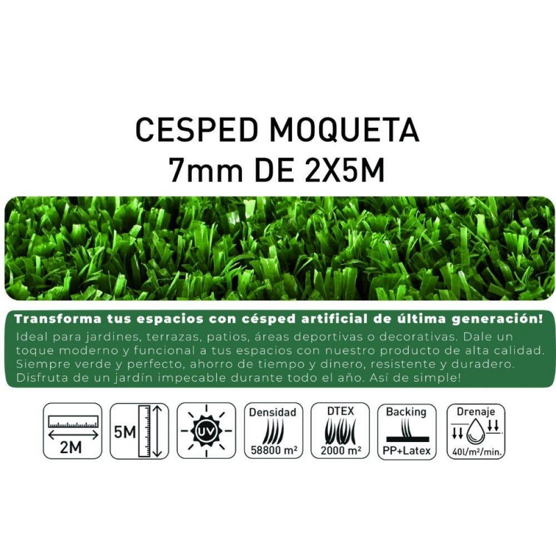 Césped artificial decorativo de 7 mm, en presentación de 2 metros de ancho por 5 metros de largo. Ideal para áreas residenciales o decorativas con excelente drenaje, fácil mantenimiento y apariencia siempre verde.