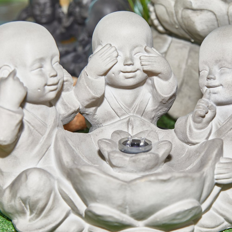 Original fuente con forma de tres pequeños buda alrededor de una fuente con forma de flor de loto, en las posturas de ver, oír y callar. Precio unitario.