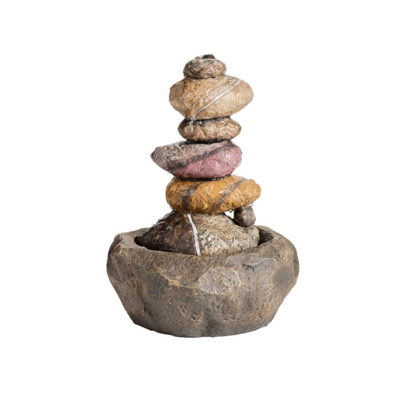 Original fuente con rocas artificiales (poliresina) de varios tamaños y colores, apiladas entre sí. Se puede utilizar tanto en interior como en el jardín o una terraza al exterior.