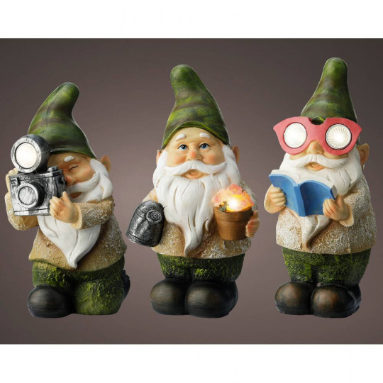 Figura de resina con forma de nomo con luz solar blanco cálido.
