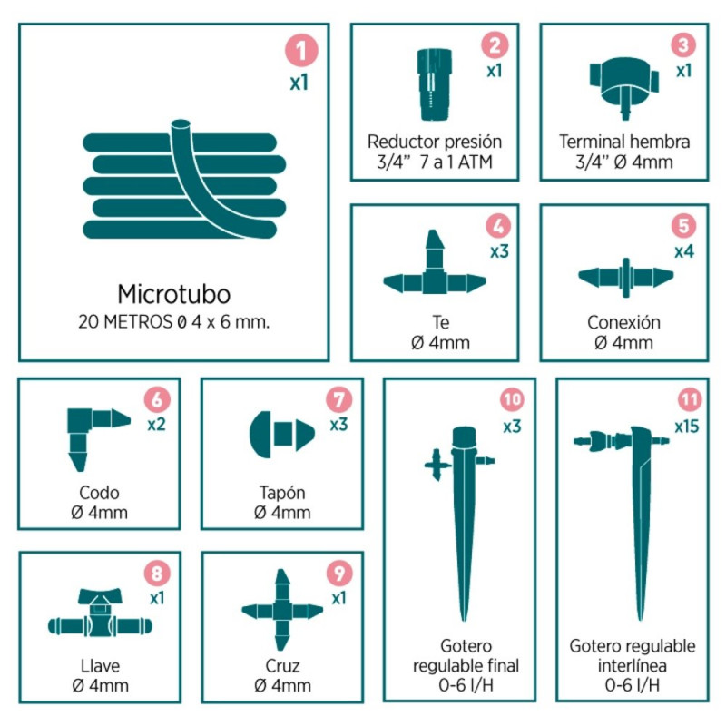 El Kit Micro riego de Verdecora se adapta perfectamente a cualquier huerto, invernadero o terraza. Las piezas que incluye cubren todas las necesidades básicas para montar un circuito de riego por goteo y, además, te permite la posibilidad de ahorrar hasta un 80% de agua. Una de sus increíbles ventajas es que puedes ampliar el contenido de este kit con las piezas de riego por goteo Verdecora, que son totalmente compatibles. Además, este kit es mucho más preciso que una manguera. De esta manera las plantas de tus espacios estarán radiantes y con un bienestar inmejorable para que puedas disfrutar de ellas mucho más tiempo.