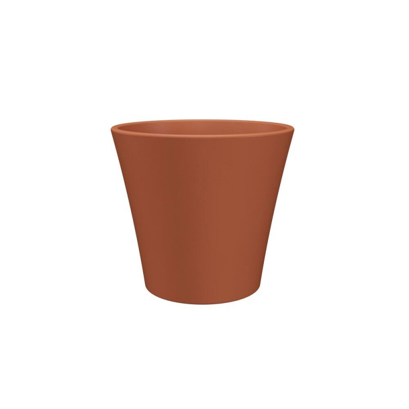 Maceta con agujero modelo Manuel fabricada con terracota (término italiano para referirse a la arcilla cocida), de diseño moderno, con líneas rectas y color rojo natural.