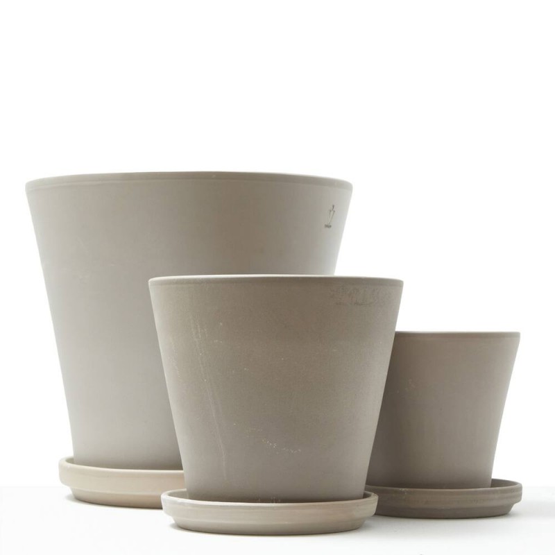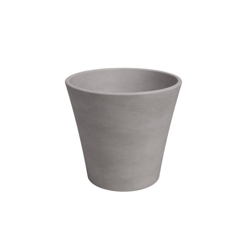Maceta con agujero modelo Manuel fabricada con terracota (término italiano para referirse a la arcilla cocida), de diseño moderno, con líneas rectas y color gris.