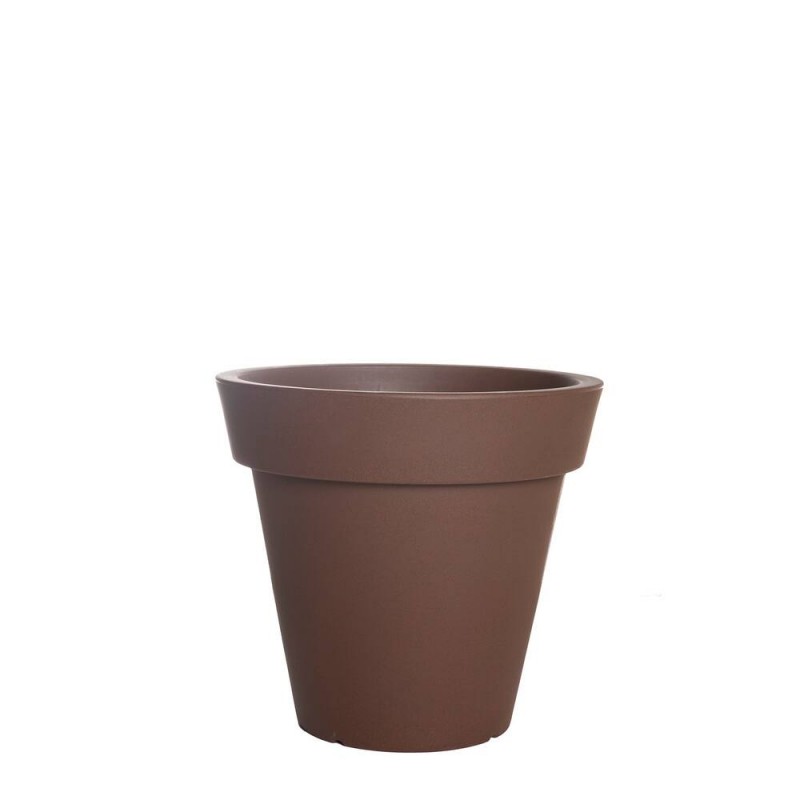 Maceta ligera de polietileno con forma redonda y borde deocrativo color marrón.