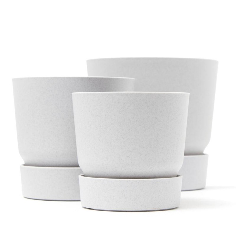 Maceta ligera redonda color gris granito que combina a la perfección con el ambiente natural de cualquier jardín, terraza o balcón. Tiene el plato integrado que actúa como una reserva de agua para que tus plantas nunca pasen sed.