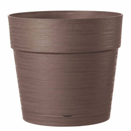 Maceta de plástico redonda color marrón caramelo con plato incorporado con sistema de clic..