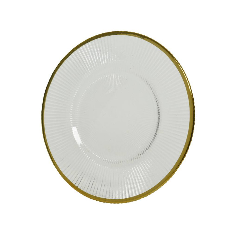 Plato llano de porcelana en vidrio transparente y detalle de borde en color dorado. Este plato tiene múltiples usos para decorar una mesa de navidad de una manera clásica y elegante.