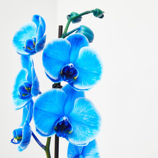 La orquídea phalaenospsis azul tintada es una planta de tipo epífita originaria del sudeste asiático en donde viven con las raíces agarradas a la corteza de los árboles o de plantas leñosas. La Phalaenopsis es una orquídea muy apreciada por su tamaño, cantidad y color de sus flores. La floración dura de 1 a 3 meses y puede darse en cualquier mes del año. Además, la simetría de las orquídeas es bilateral, igual al rostro humano.