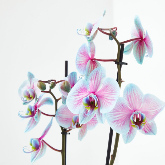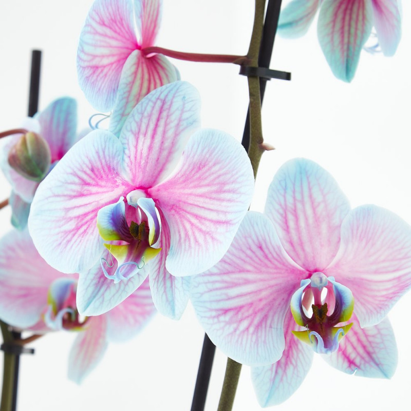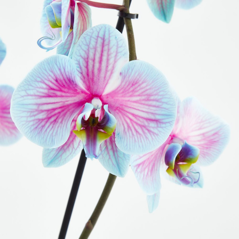 La orquídea phalaenospsis tintada en dos colores es una planta de tipo epífita originaria del sudeste asiático en donde viven con las raíces agarradas a la corteza de los árboles o de plantas leñosas. La Phalaenopsis es una orquídea muy apreciada por su tamaño, cantidad y color de sus flores. La floración dura de 1 a 3 meses y puede darse en cualquier mes del año. Además, la simetría de las orquídeas es bilateral, igual al rostro humano.