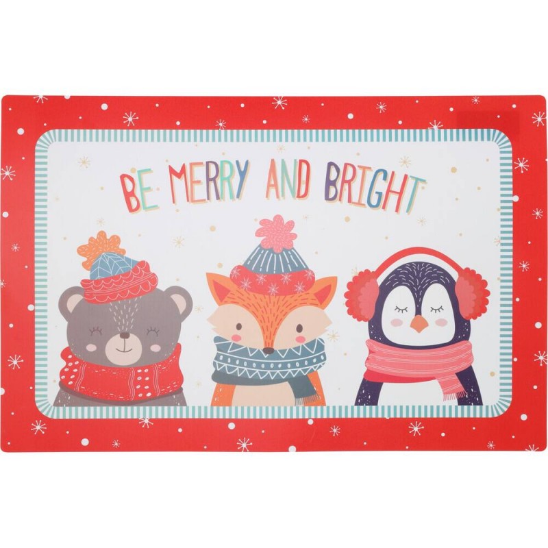 Salvamantel navideño decorado con adorables personajes festivos como un oso, un zorro y un pingüino, y acompañado del mensaje "Be Merry and Bright", es ideal para proteger tu mesa durante las comidas navideñas.