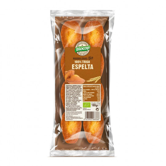 Magdalenas elaboradas con harina de espelta 100%, azúcar de comercio justo y huevos de corral ecológicos. Sin aceite de palma. Paquete de 8 unidades.