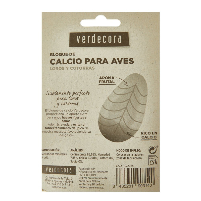 Calcio para aves Verdecora. Suplemento perfecto para pequeñas y grandes psitácidas. El calcio Verdecora proporciona un aporte extra para unos huesos fuertes y sanos. Además ayuda a evtiar el sobrecrecimiento del pico de nuestra mascota favoreciendo su desgaste.