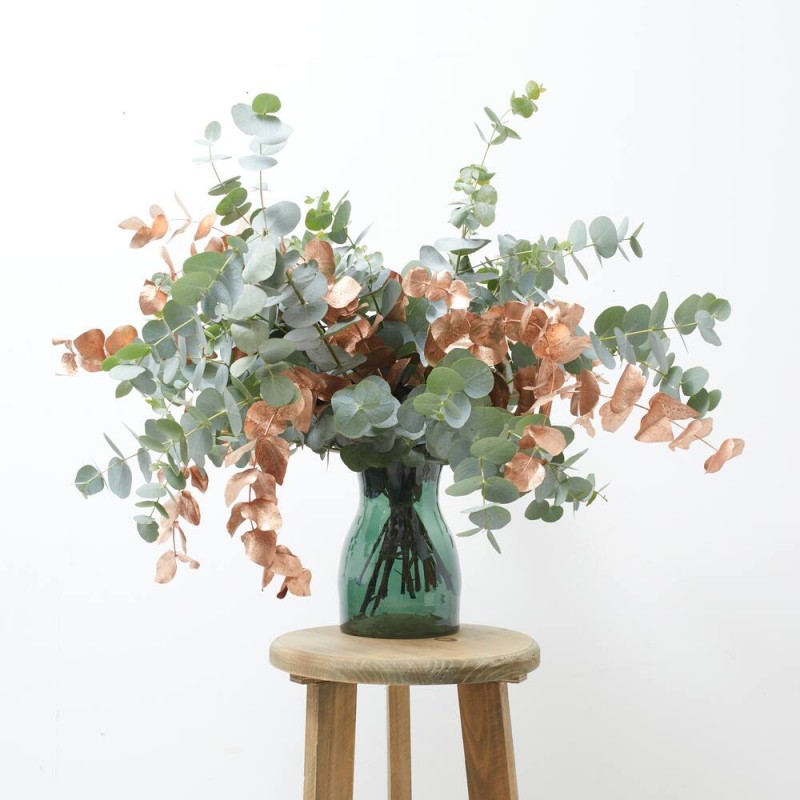 Este ramo tiene una combinación de hojas de eucalipto verdes y hojas de eucalipto teñidas en tonos cobre, creando un contraste visual atractivo y elegante. Las hojas de eucalipto, con su característico color verde azulado, aportan frescura y un toque silvestre, mientras que las hojas en tonos cobrizos añaden un aire cálido y otoñal. Este ramo destaca por su simplicidad y armonía de colores, ideal para quienes buscan un arreglo que combine lo natural con un toque sofisticado y moderno. La mezcla de texturas y colores hace que sea un arreglo llamativo sin ser recargado.