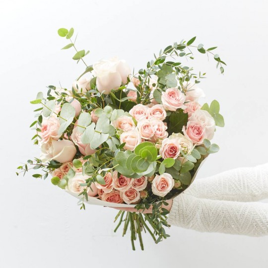 La rosa color rosa tiene un significado de amistad y aprecio. También es un símbolo de simpatía, franqueza y amabilidad. La intensidad del rosa representa la intensidad del sentimiento. Las rosas pastel y empolvadas del ramo Cannes son el símbolo más puro de la dulzura.