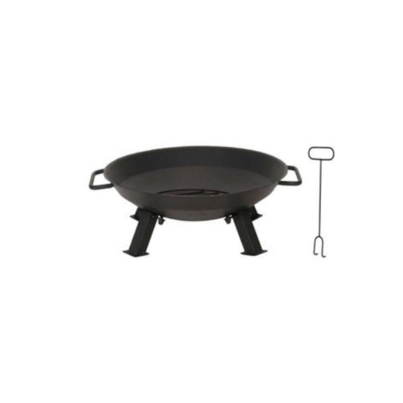Brasero metálico de 46 cm de diámetro con patas estables y accesorio para manipular el fuego. Ideal para exteriores, aporta calor y ambiente acogedor.
