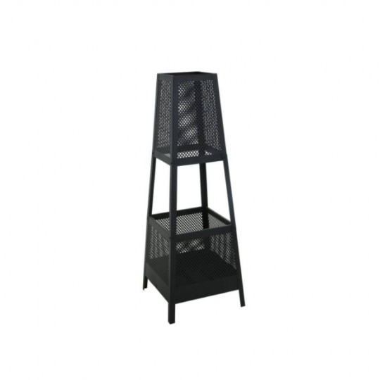 Chimenea metálica de diseño piramidal en color negro, perfecta para exteriores. Su estructura abierta permite una excelente circulación de aire y una experiencia acogedora alrededor del fuego.