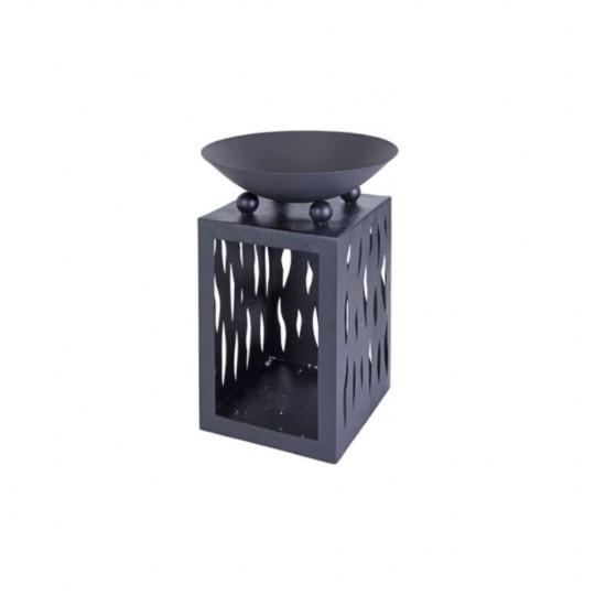 Brasero metálico con diseño moderno, incluye espacio inferior para almacenar leña. Ideal para exteriores, combina funcionalidad y estilo en terrazas y jardines.