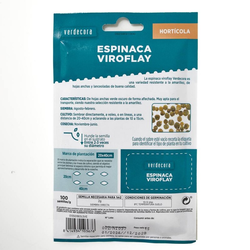 Semillas de Espinaca Viroflay. De hojas anchas verde oscuro y forma aflechada. Resistente al amarilleo.