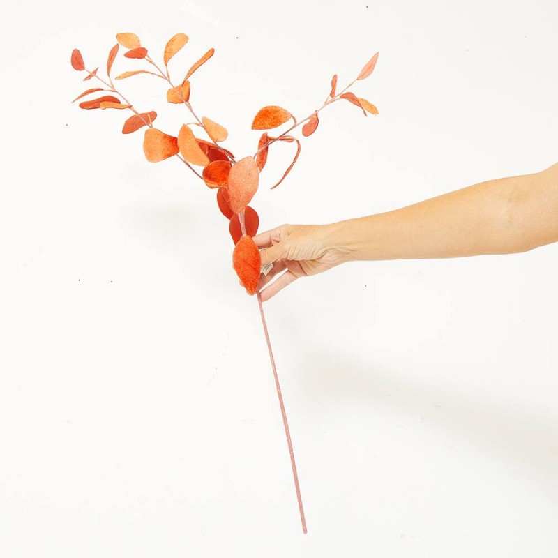 Rama artificial de eucalipto en tono naranja, perfecta para arreglos otoñales, jarrones y decoración de temporada.