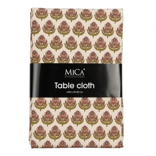 Mantel rectangular de 250x140 cm confeccionado en tejido resistente, con diseño estampado sobre fondo beige. Su acabado combina elegancia y practicidad, aportando un estilo decorativo a la mesa al mismo tiempo que protege la superficie. Ideal para el uso diario o para ocasiones especiales, gracias a su formato amplio que se adapta a mesas grandes.