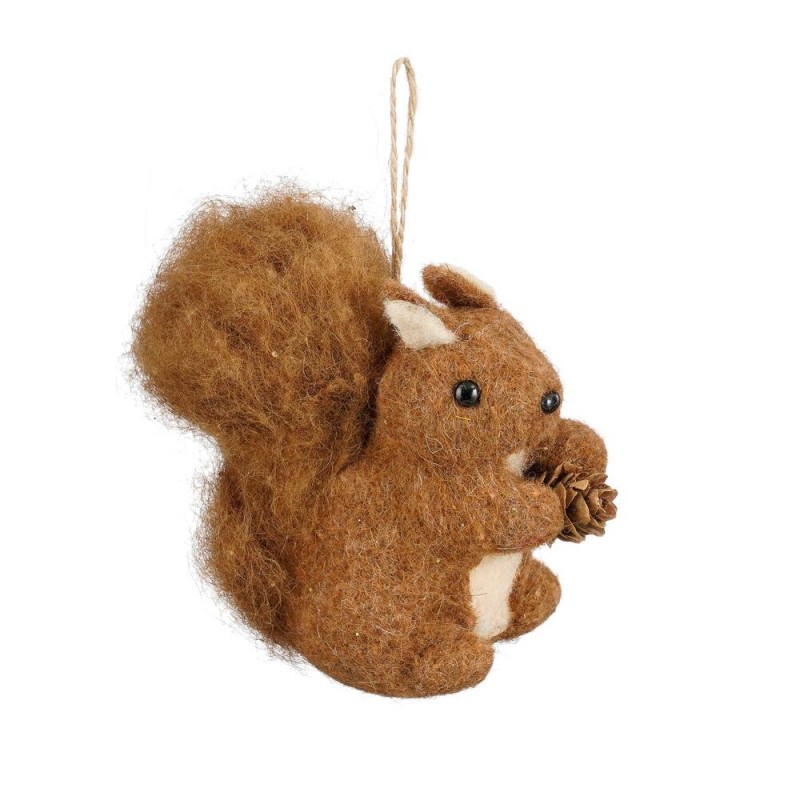 Adorno colgante en forma de ardilla, elaborado en felpa suave con acabado realista en tonos marrones. Con medidas de 12 cm, incluye detalle de cola esponjosa y pequeña piña en las patas. Ideal para colgar en el árbol de Navidad, guirnaldas o decorar espacios acogedores con un toque tierno y natural.