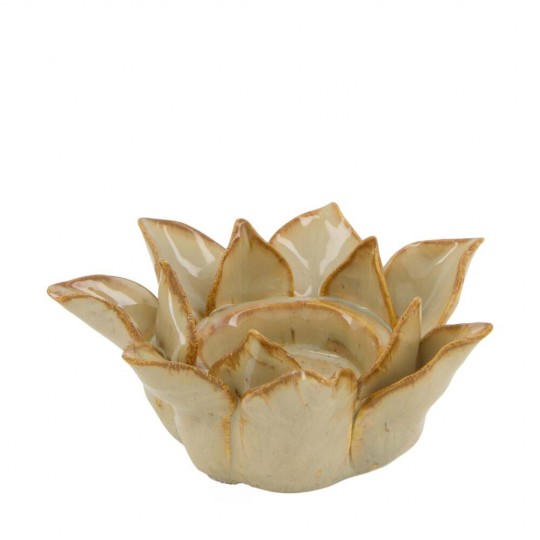 Portavelas decorativo de cerámica con forma de flor de pétalos abiertos, ideal para crear ambientes cálidos y elegantes.