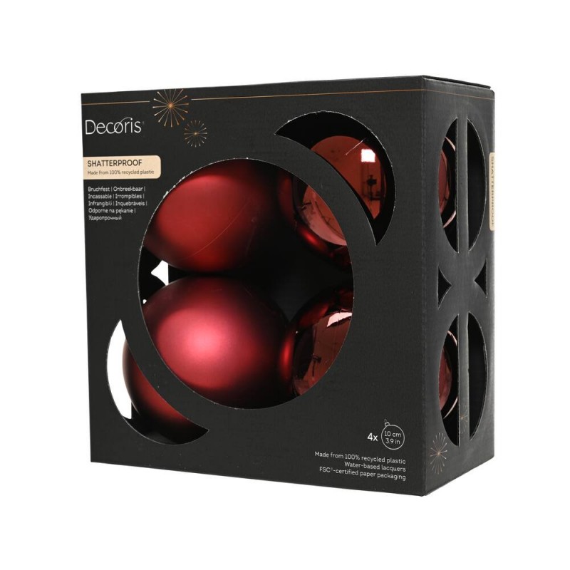 Caja de 4 bolas de diámetro 10cm en color burdeos combinadas acabado mate y brillo. Un pack de colgantes sencillos y elegantes, perfectos para decorar el abeto de navidad o para personalizar coronas y guirnaldas.