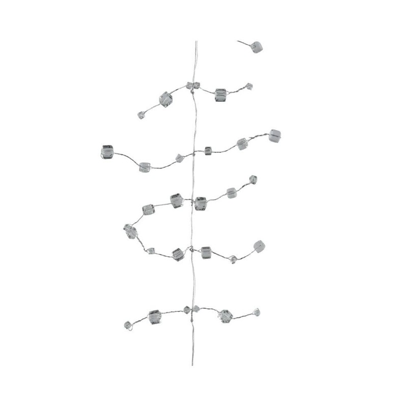 Guirnalda decorativa de 180 cm de longitud y está formada por un hilo transparente o metálico fino del que cuelgan pequeños elementos en forma de cuentas y prismas que simulan cristales. Estas piezas tienen distintas formas geométricas y superficies facetadas que reflejan la luz, creando destellos brillantes y elegantes. Su aspecto delicado y luminoso la hace ideal para decorar árboles de Navidad, mesas, ventanas o integrarla en arreglos florales, aportando un toque sofisticado y festivo a cualquier ambiente.