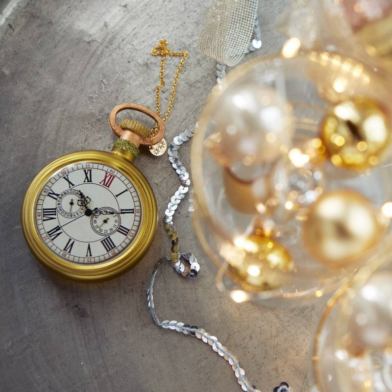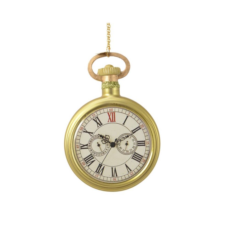 Elegante reloj de bolsillo con colgante de diseño clásico con acabado en tono dorado, acompañado de una cadena para colgar. Su esfera muestra números romanos enmarcados en un fondo claro, con dos subesferas decorativas que aportan un toque sofisticado. Con una altura total de 11 cm.