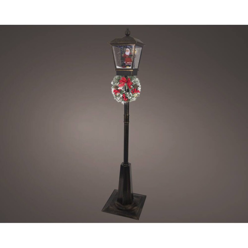 Farola decorativa navideña en color negro con 33 luces LED cálidas. Incluye detalles festivos con guirnalda y lazo, ideal para ambientar interiores y exteriores con un toque clásico y acogedor.
