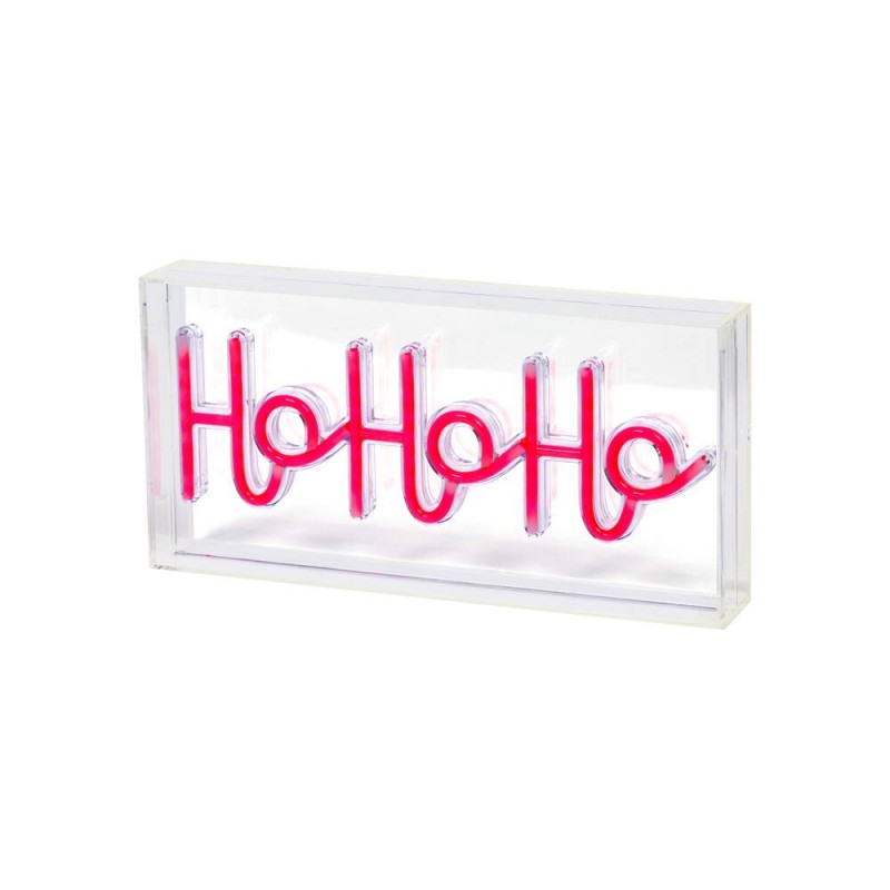 Cartel decorativo con texto “HoHoHo” en efecto neón LED rojo. Con 90 luces integradas, es perfecto para interiores, aportando un toque divertido, festivo y moderno en la decoración navideña. Este producto funciona con energía a través de USB, lo que lo hace práctico y fácil de instalar en cualquier espacio interior con acceso a una conexión USB.