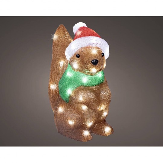 Figura decorativa de ardilla navideña con gorro de Papá Noel y bufanda verde, iluminada con 50 luces LED cálidas. Perfecta para dar un toque tierno y festivo a interiores y exteriores.
