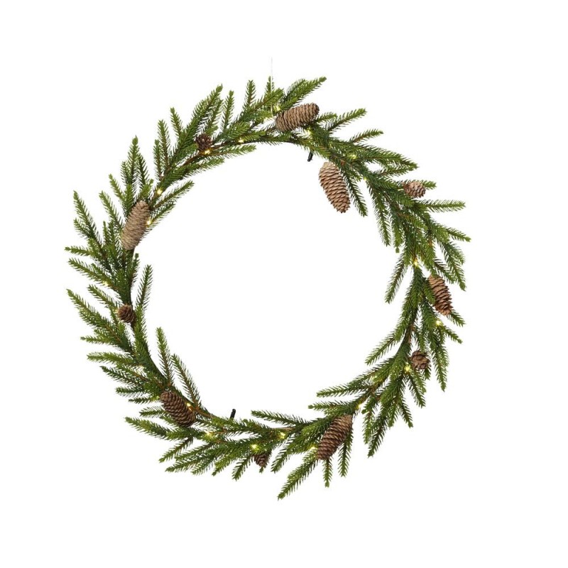 Corona decorativa de estilo slim con ramas verdes naturales y piñas integradas, perfecta para aportar un toque navideño sutil y elegante en puertas, ventanas o paredes.