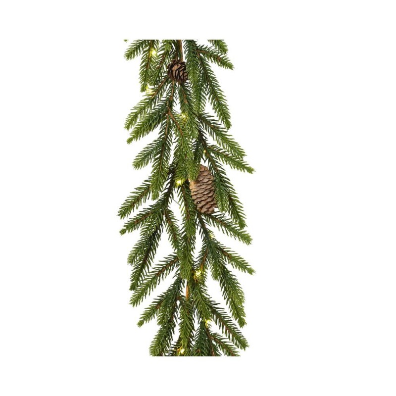 Guirnalda navideña tipo slim con ramas verdes, piñas naturales y luces LED integradas. Perfecta para decorar barandales, repisas o marcos de puertas con un toque clásico y elegante. Medida: 180 cm de largo.
