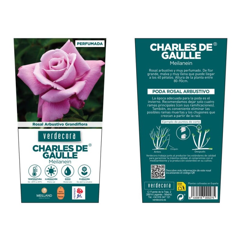 El rosal arbustivo grandiflora Charles de Gaulle es un rosal de flor grande, de color malva, con una flor muy llena que puede llegar a tener 40 pétalos.