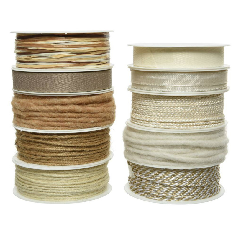 Cordón de algodón en colores beige y naturales y diferentes acabados. Este cordón tiene múltiples usos decorativos y es perfecto para dar un toque artesanal y único a los regalos navideños.